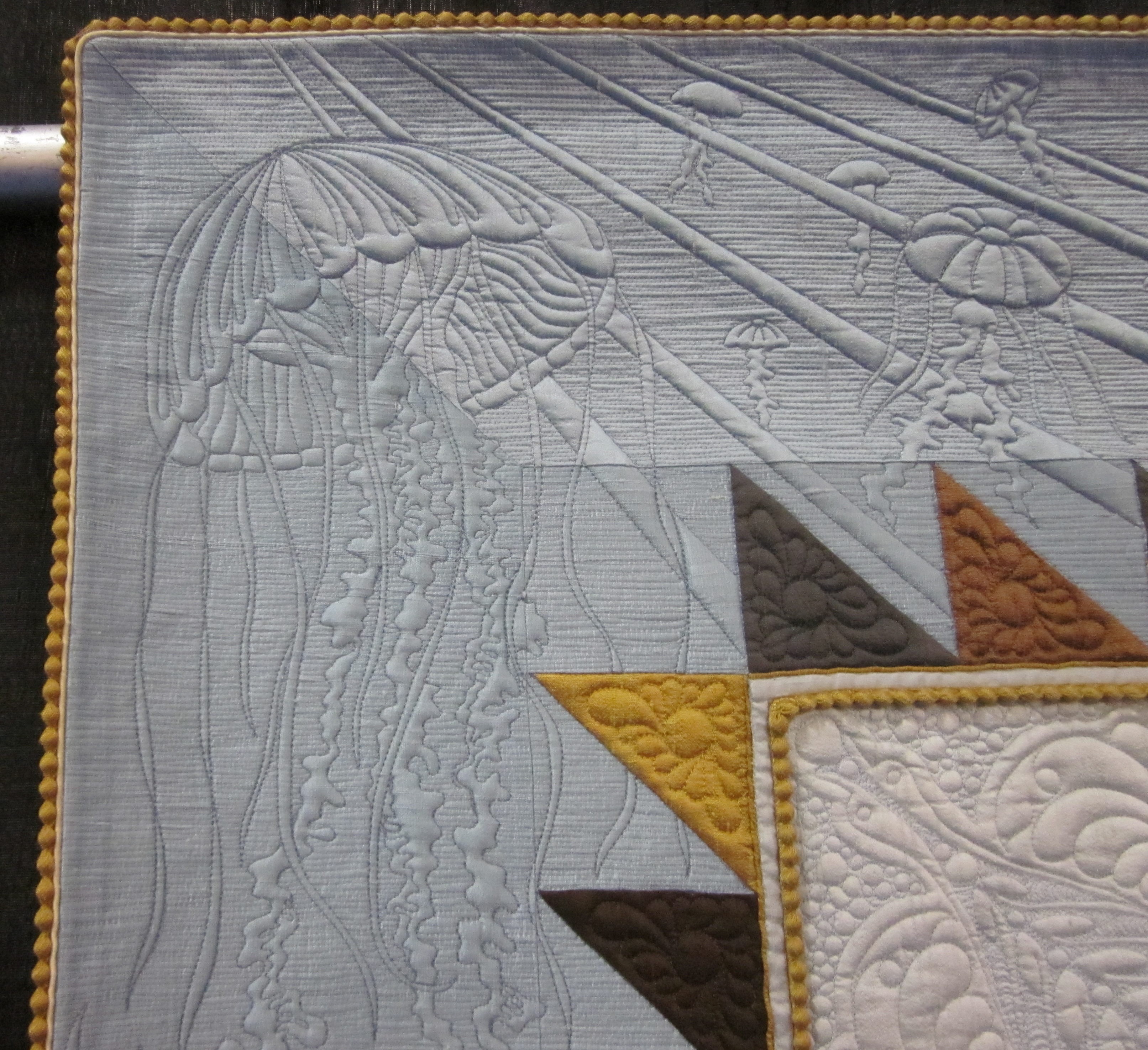 The detail is stunning! She used a copy of the photo as the label on the back. The borders were  quilted with various marine animals, and my favorite is the corner with the jellyfish.