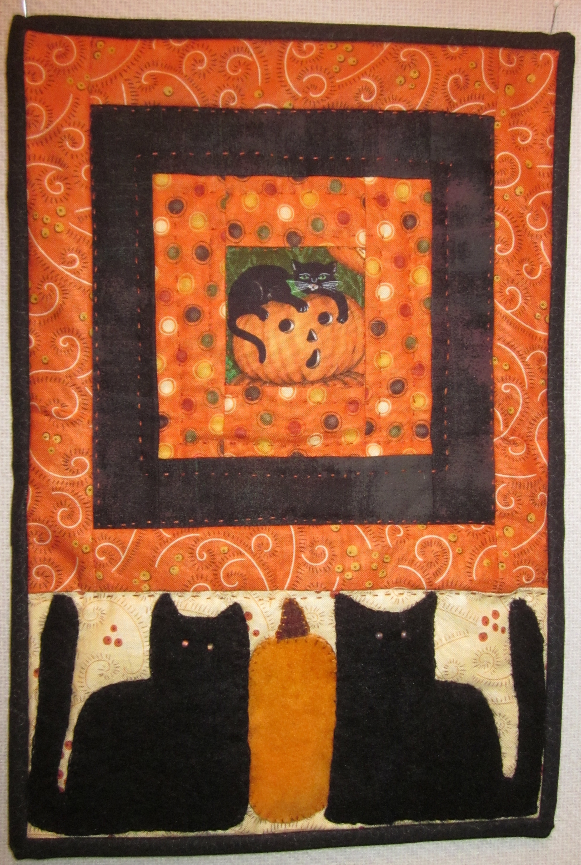 Isn’t this a wonderful little quilt? My BFF quilting friend Janis Turocy made it for me and it surprised me arriving in the mail at work one day. I simply love it! I have a “thing” for black cats–three share our house and three more feral cats live in the yard (yes, that’s six black cats!)–so this just makes me smile. The cats and pumpkin are wool and are hand blanket stitched, the rest is cotton and the entire quilt is hand quilted. Over-all it’s 9 x 13.5 inches and is the perfect accent in my cubicle at work. It may NOT come down November 1st! Happy Halloween everyone!
