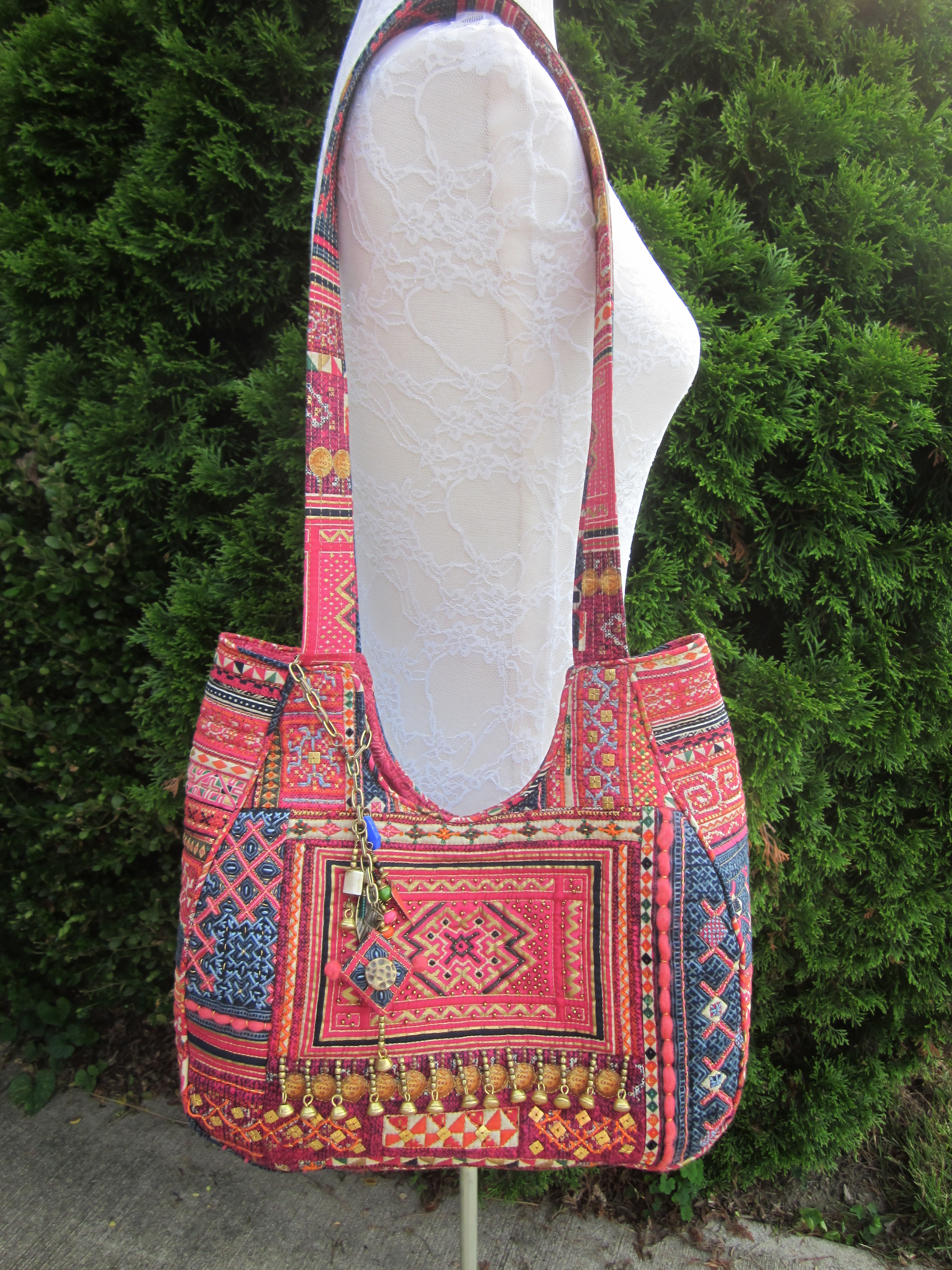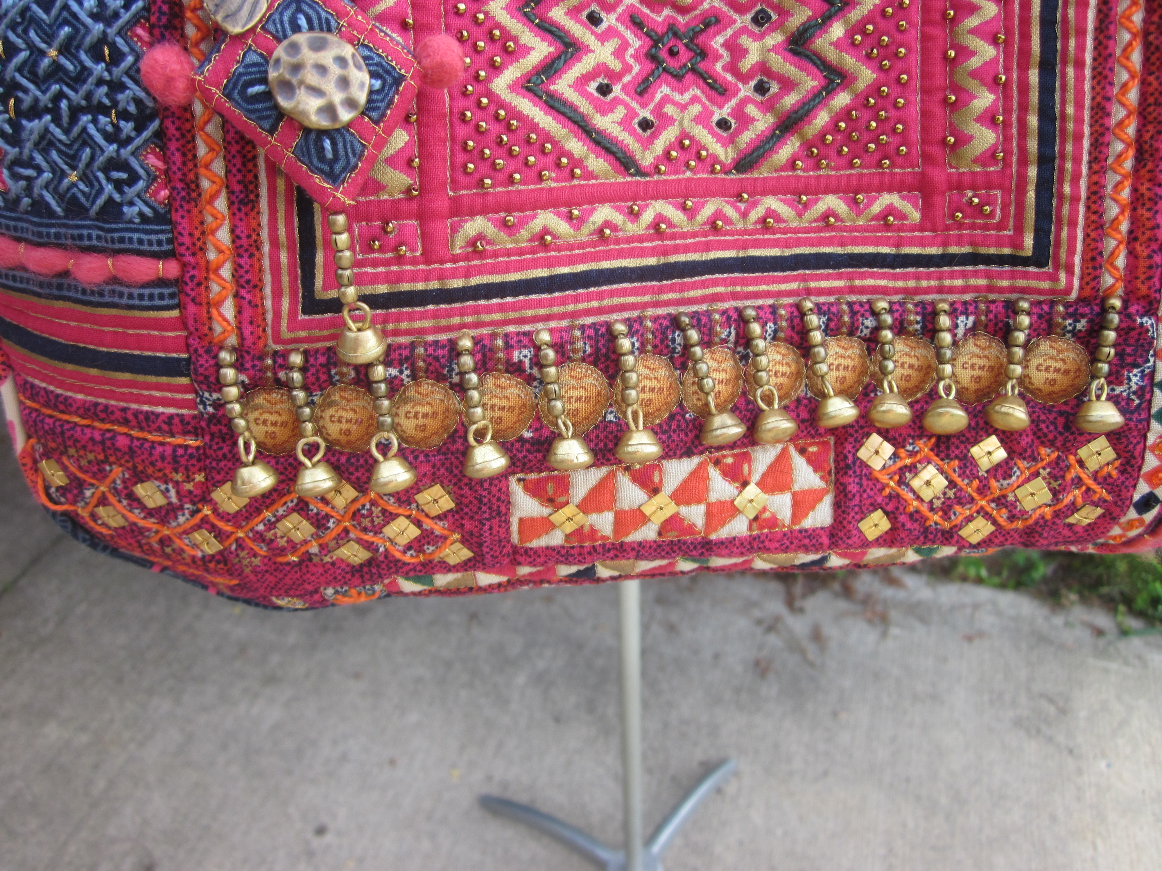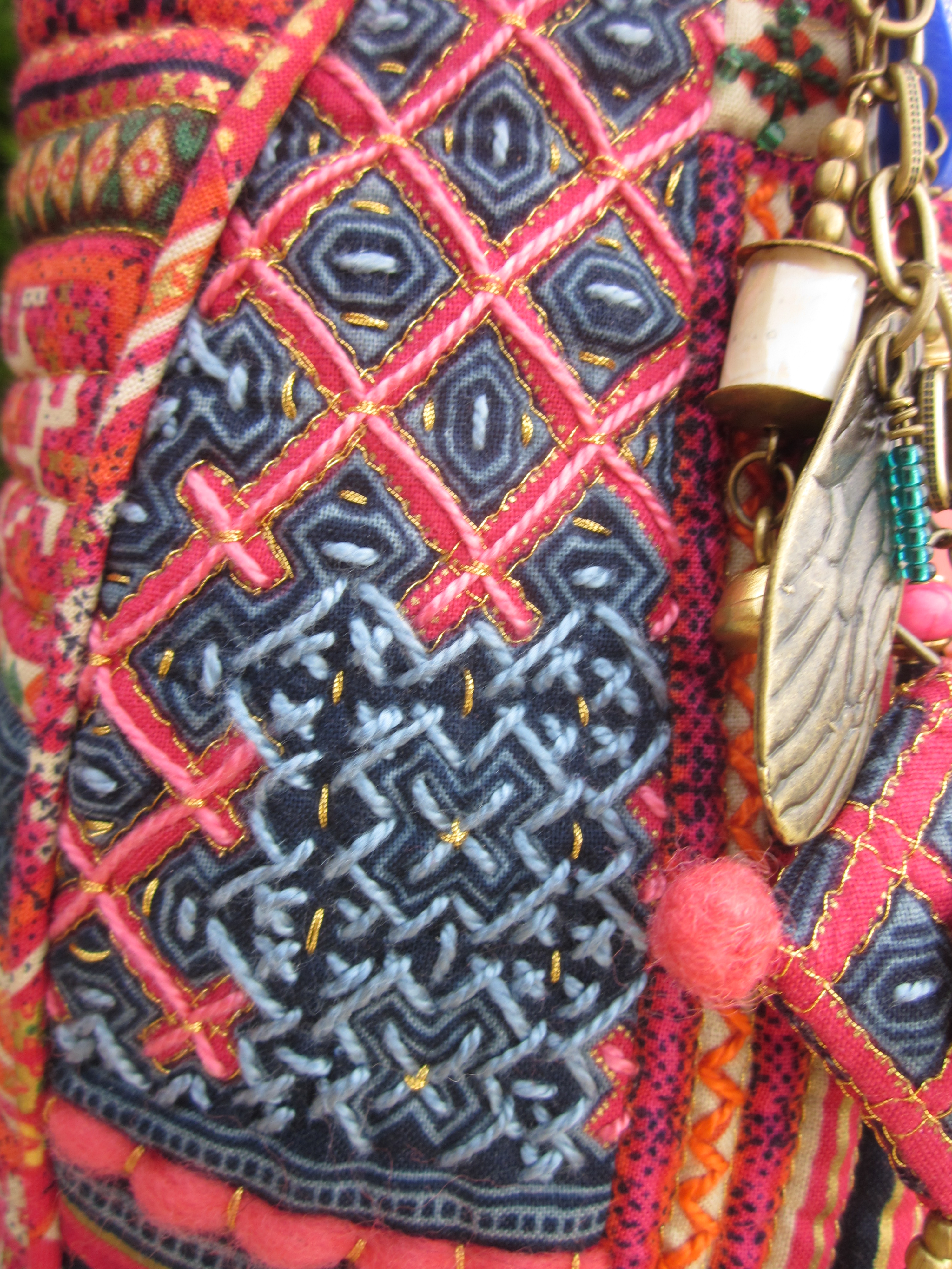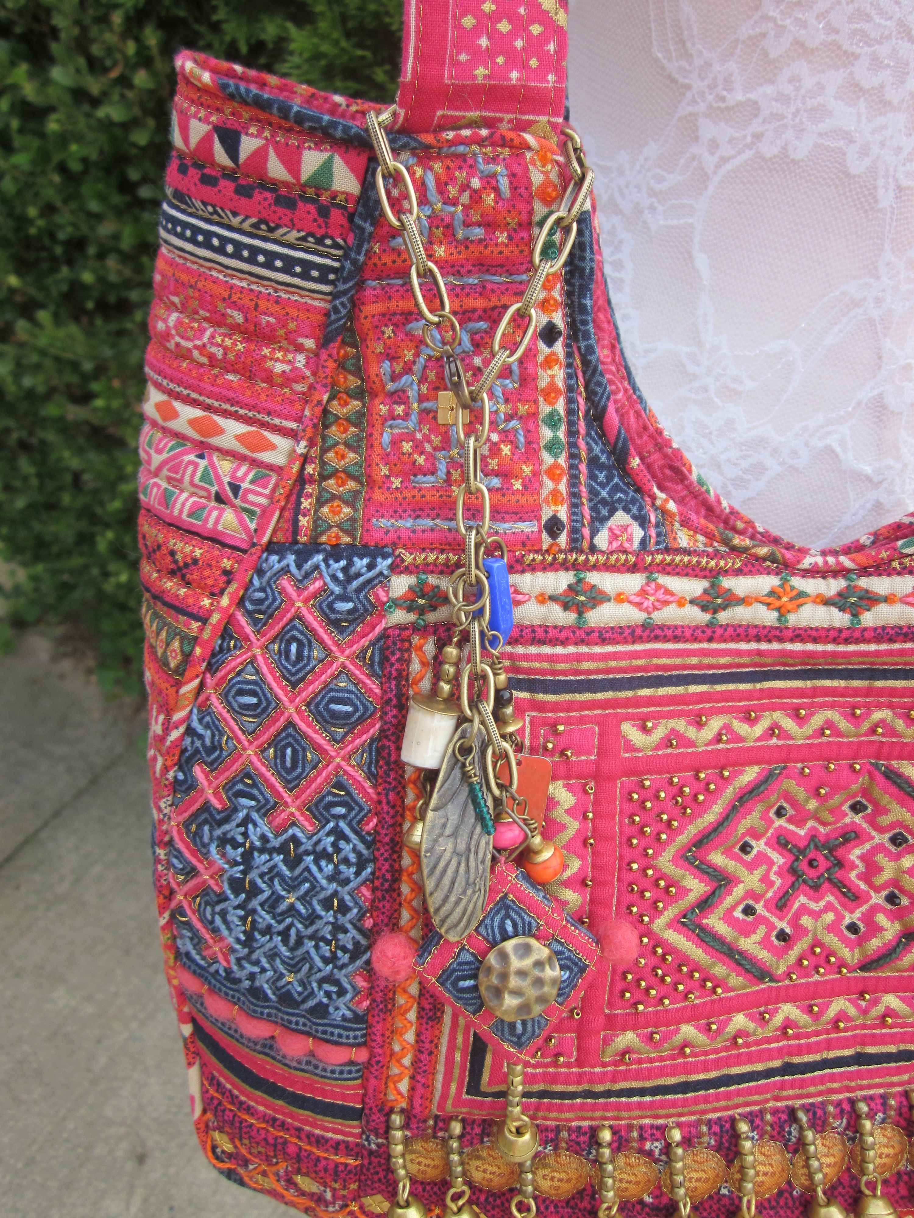 IMG_1466Meet Serendipity, my Hoffman Challenge entry. I loved this fabric the moment I saw it and knew I had to feature that little “magic carpet” on my bag. I had started in a completely different direction and wasn’t happy with it so when my friend suggested I look at ethnic bags on line for inspiration, I dumped the first concept in a heartbeat and everything fell into place almost effortlessly. I modified “Abigail” from Chris W Designs for size regulations of the challenge and was off having fun. A skirt from a thrift store provided the brass beads, sequins and dangles and I did a lot of surface embellishing. Here’s a few more shots of my “baby”: