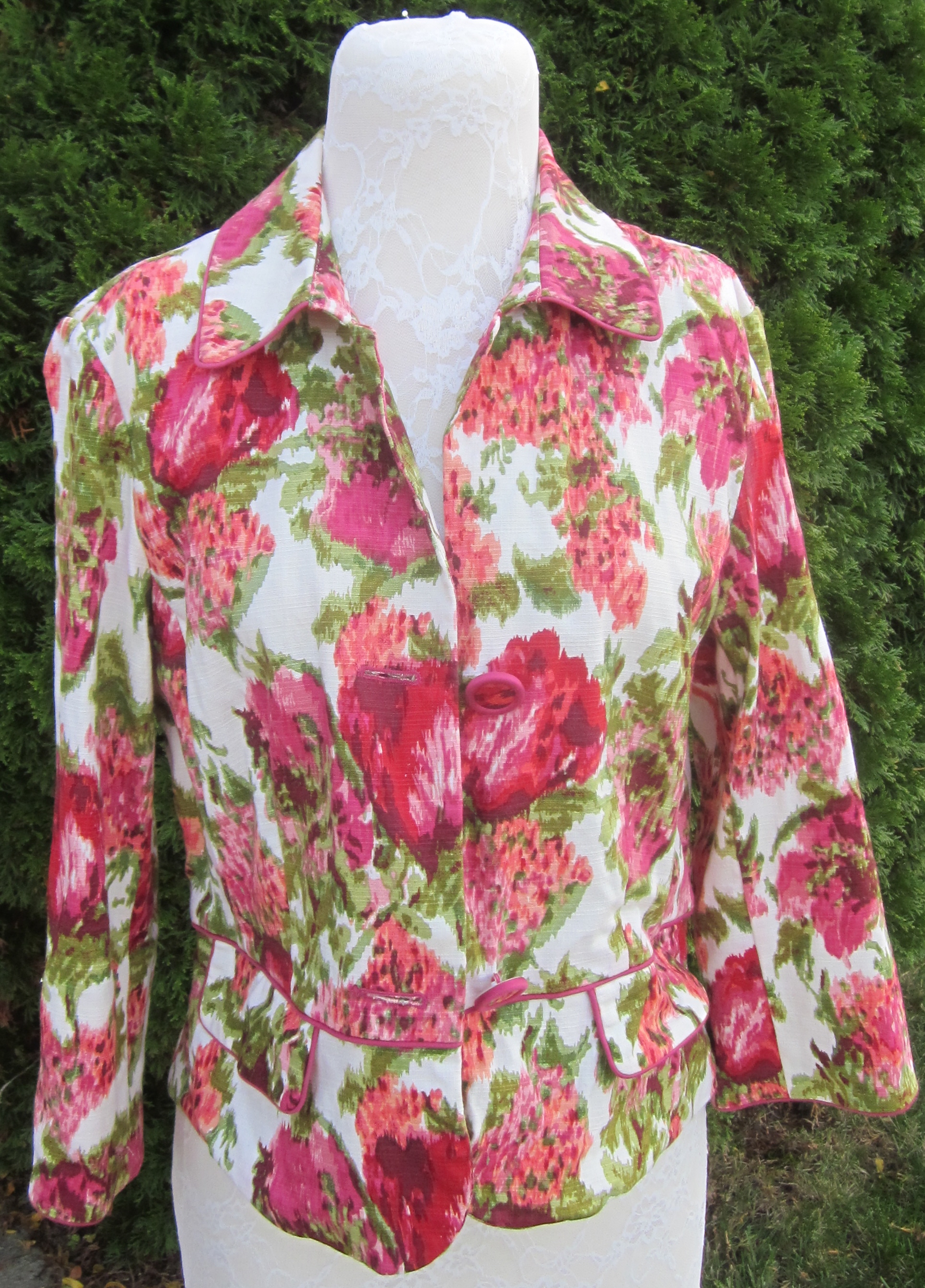 I love cruising a thrift shop looking for previously loved garments made from fantastic fabrics that I can recycle/upcycle into something new and fun. I found this Bandolino jacket this past summer that had to go home with me:IMG_1697 crop